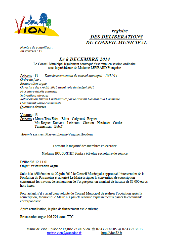 Vous trouverez ci-dessous le Compte-rendu du Conseil Municipal en date du 08/12/2014,